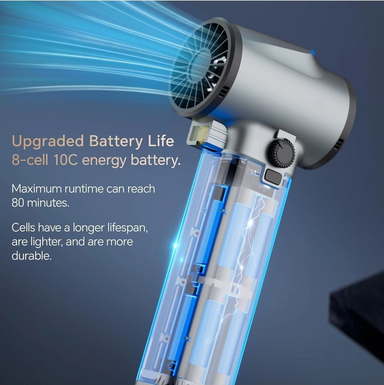 باتری قابل شارژ: این دمنده هوا خشک کن ماشین بی سیم دارای یک باتری لیتیومی داخلی 4000 میلی آمپر ساعتی است و با یک آداپتور برای شارژ راحت ارائه می شود. حمل آن در حین حرکت آسان است. با زمان شارژ 2.5 ساعته، مدت زمان کارکرد تقریباً 12 تا 80 دقیقه و حالت توربو حدود 6 دقیقه را ارائه می دهد.