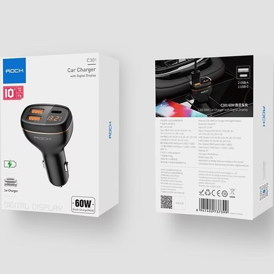 شارژر فندکی سریع راک مدل ROCK C301 60W دو خروجی USB و یک خروجی Type-C دارد و میتواند به طور همزمان سه دستگاه را شارژ کند. شارژر فندکی ۳ پورت راک از گستره وسیع ولتاژها از ۱۲ تا ۲۴ ولت پشتیبانی میکند. از این رو با بیشتر انومبیلهای موجود در ایران سازگار است و شما میتوانید به راحتی موبایل خود را داخل ماشین شارژ کنید.