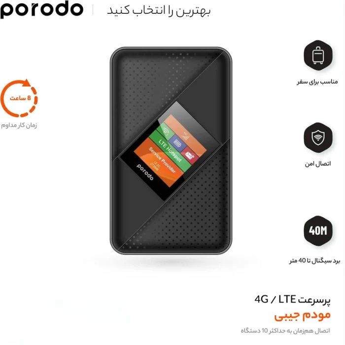 چه در سفر کاری باشید یا گردش خانوادگی، مودم قابل حمل پرودو 4G LTE مدل pd-pt4grv2 به شما امکان میدهد با جهان در ارتباط بمانید.